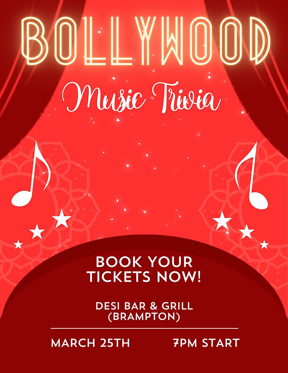 Get ready for a fun-filled evening celebrating everything Bollywood music! Join us in person at Desi Bar & Grill, Brampton, for a night packed with music questions that will challenge your knowledge and have you dancing along. Whether you're a die-hard Bollywood fan or just looking to hang out with friends, this event's the perfect vibe. Don't miss out on the laughs, masti, and Bollywood memories!