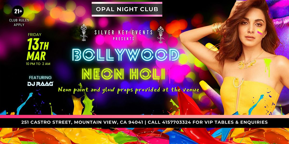 Celebrate Holi dancing at the BOLLYWOOD PARTY,surrounded by vibrant Neon colors at one of the hottest clubs in Bay Area - OPAL Night Club hosted by Silver Key Events.
