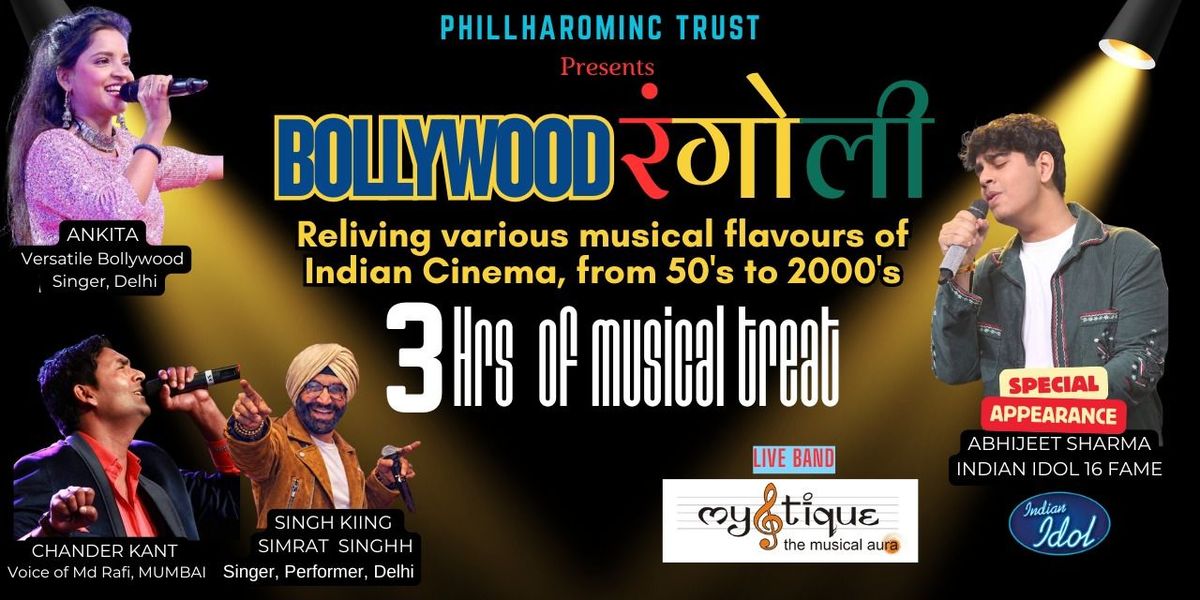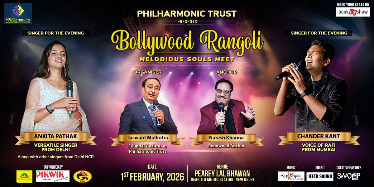 “Bollywood Rangoli” is a vibrant live musical evening celebrating the magic of Bollywood — from soulful retro melodies to energetic modern hits. The event features talented singers from Delhi NCR performing evergreen songs with a live orchestra. Presented by Philharmonic Trust, it promises an unforgettable blend of nostalgia, rhythm, and color in true Bollywood style.