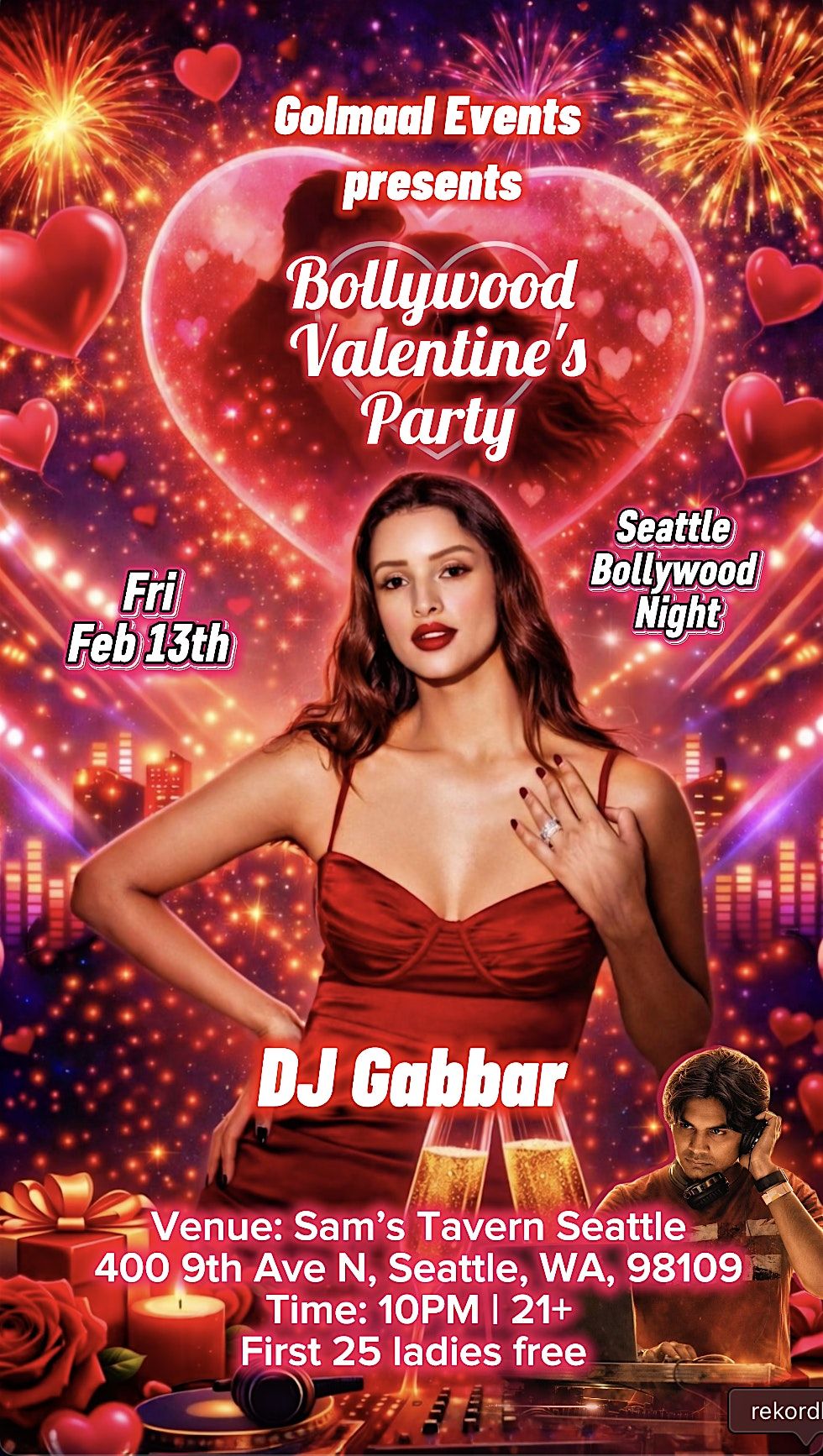 This is a ticketed Bollywood dance party with a dedicated dance floor area for partygoers, creating a true club-style experience inside Samās Tavern. Come dance, vibe, and celebrate Valentineās weekend the Bollywood way.