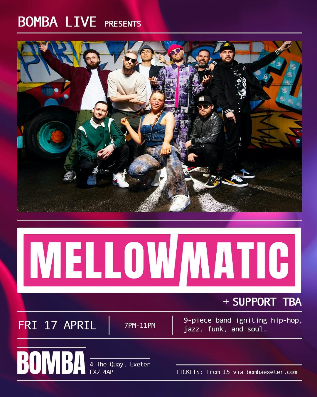 9-piece UK powerhouse Mellowmatic touches down in Exeter, bringing a genre-bending explosion of hip-hop, neo-soul, and jazz-funk grooves, with all the raw energy of hard rock.