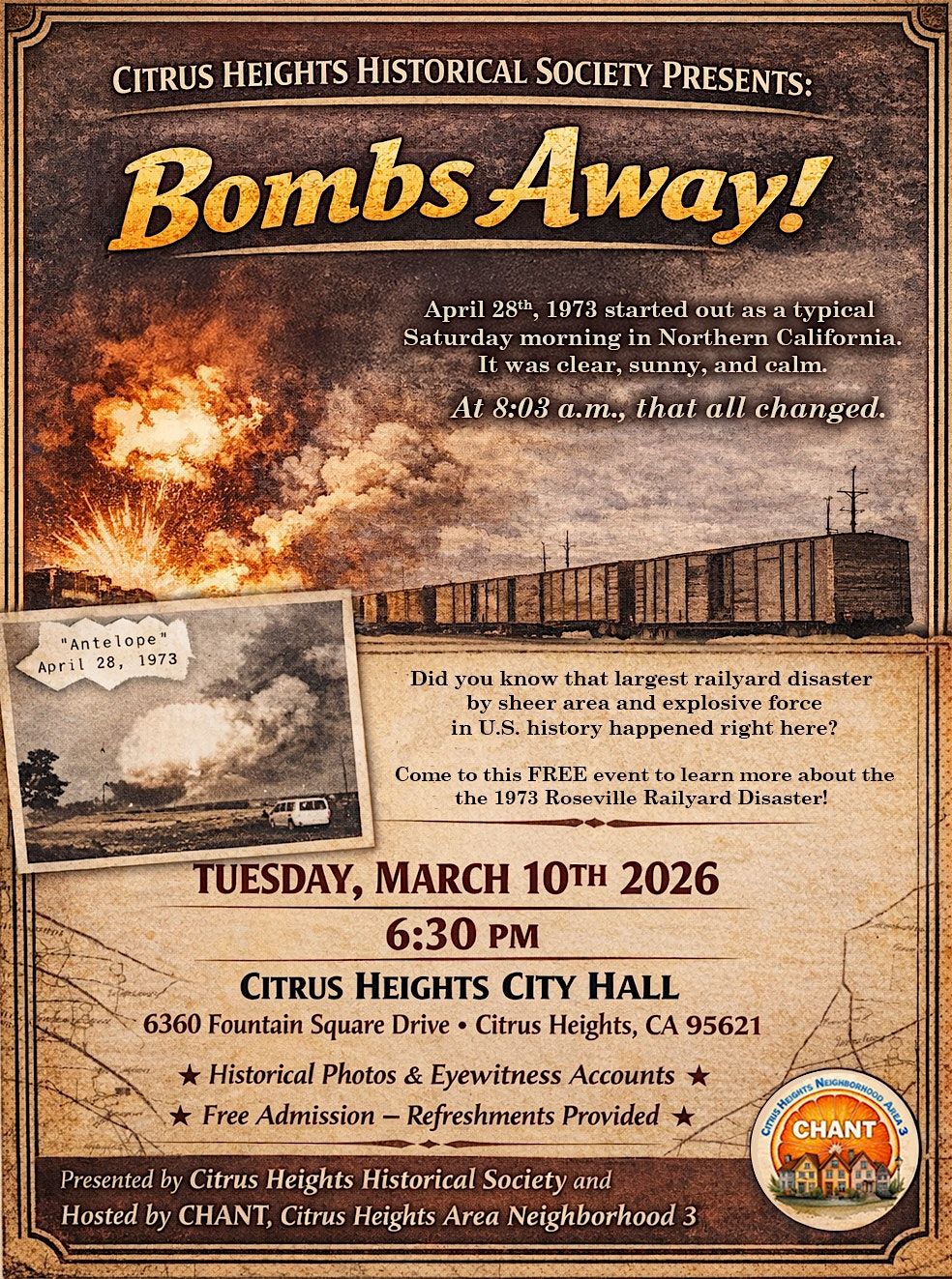 Join us in Citrus Heights for Bombs Away! with the Historical Society & CHANT—history and fun collide!About this Event