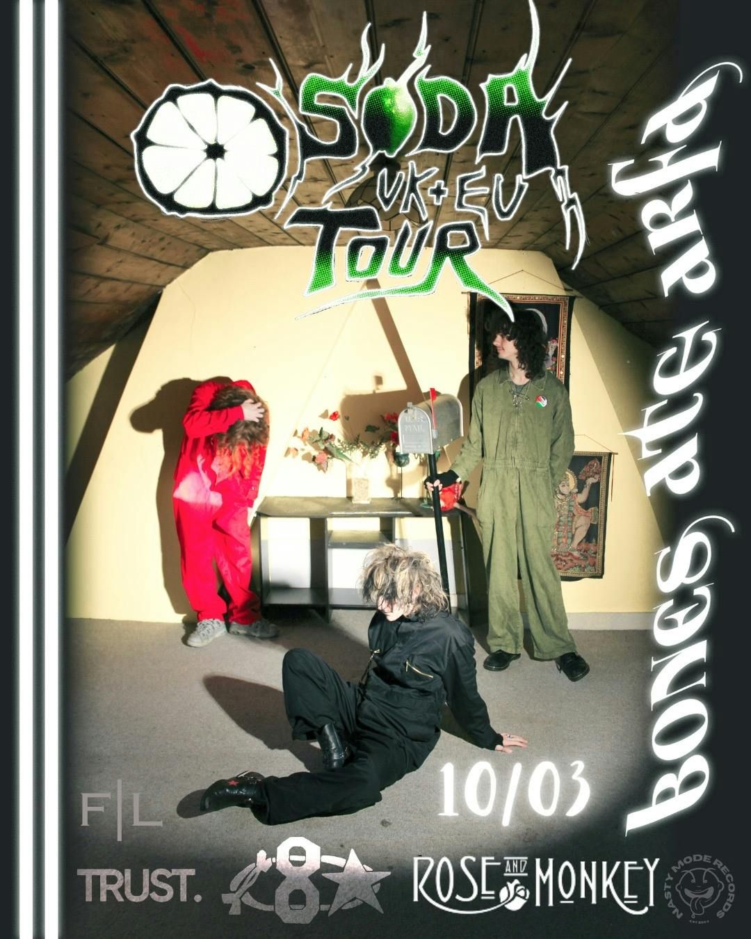 Bones Ate Arfa are a UK psychedelic street punk/desert rock three piece, made up of Bones (guitar), 8 (drums), and Arfa (vocals & bass). Once described as “Junkyard dog riffs” after the release of their debut single ‘Asbestos’, they have since gained recognition online and in person from Artists such as Muse, Fred Durst (Limp Bizkit), Isaac Holman (SOFT PLAY), Royal Blood, Tigercub, cool sorcery, Demob Happy, and Bad Nerves.While attaining a respectable following on social media, they have received spins and features on Clash Magazine, BBC Radio 6, Radio X, Dork, Earmilk, Louder Than War, and have successfully burned their stamp into the UK’s southern gig circuit, all in under two years.brilliant support to be announced soon