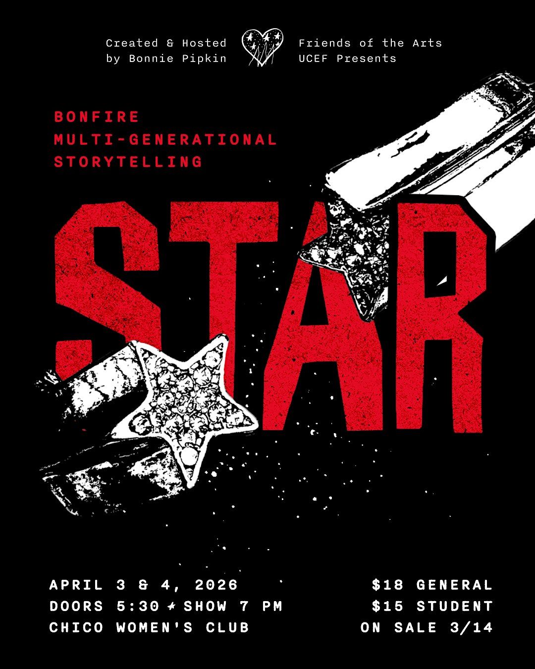 Bonfire is a multi-generational storytelling event held the first week of every EVEN month at the Chico Women's Club. April's theme is "STAR" and each person will interpret that in any direction they choose with a 10-minute personal & true story.