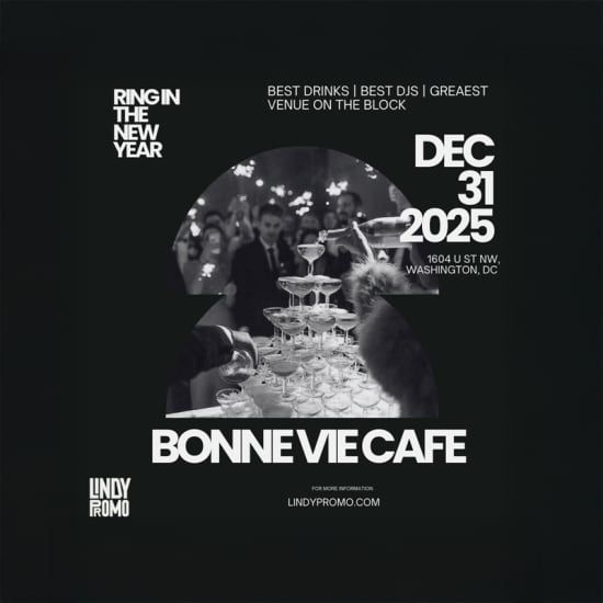 🎁 Gift this experience to your loved ones! Click here to check out our gift card. ⭐ Celebrate NYE 26 at Bonne Vie Cafe & Bistro in Washington DC! Get your tickets now for this unforgettable New Year’s Eve party! Highlights 🍽️ Enjoy a delicious 1-hour service of passed hors d’oeuvres to kick off the night. 🎧 Dance to live DJ spinning the hottest Top 40, Hip-Hop, and House hits. 🥂 Join the DJ-led midnight countdown with a complimentary champagne toast. 🎉 Experience a buzzing, stylish crowd and vibrant party atmosphere. 🏙️ Celebrate in a multi-level venue right in the heart of Washington DC. General Info 📅 Date: December 31, 2025 ⏰ Time: 9:00 PM – 2:00 AM (Late Admission: 12:30 AM – 2:00 AM) 📍 Location: Bonne Vie Cafe and Bistro, 1604 U Street Northwest, Washington, DC, US 20009 👗 Dress code: Semi-formal attire recommended for a chic NYE experience Description Ring in the New Year at Bonne Vie Cafe, one of DC’s most dynamic nightlife destinations. Known for its lively atmosphere and stylish crowd, Bonne Vie sets the stage for a high-energy NYE celebration. The evening begins with a delightful 1-hour service of passed hors d’oeuvres, followed by an electrifying mix of Top 40, Hip-Hop, House, and Mash-Ups to keep the dance floor moving. As midnight approaches, the DJ leads an exciting countdown, followed by a complimentary champagne toast to welcome 2026. Don’t miss out on this extraordinary experience — get your tickets now for Bonne Vie Cafe & Bistro NYE26 DC Tickets Washington DC!