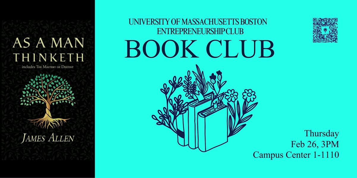 Join the UMass Boston Entreprneurship Club for our in-person book club where we'll dive into the classic As a Man Thinketh by James Allen. This will be a casual gathering for anyone interested in exploring how our thoughts shape our actions and apply such lessons to leadership and entrepreneurship. Bring your favorite notes, and let's have a great conversation!