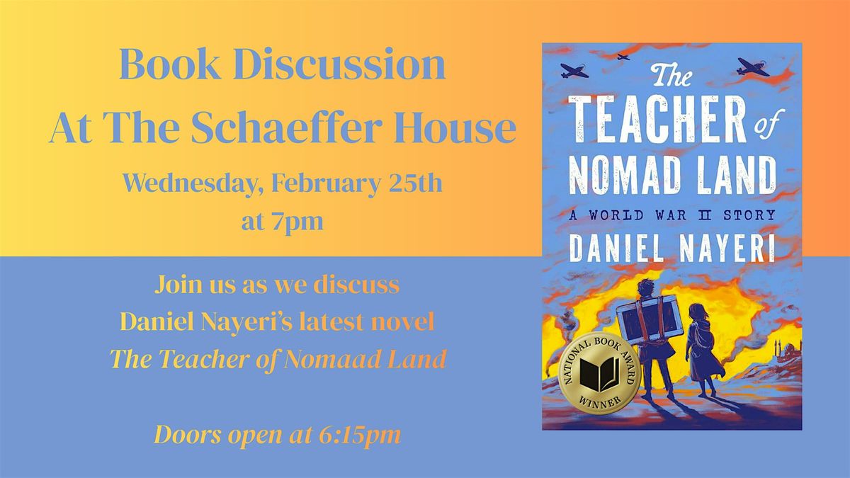 Join us at The Schaeffer House on August 13th for a discussion of The Teacher of Nomad Land by Daniel Nayeri. This is Daniel's latest novel and recently won the National Book Award. Doors open at 6:15; Discussion starts at 7pm.