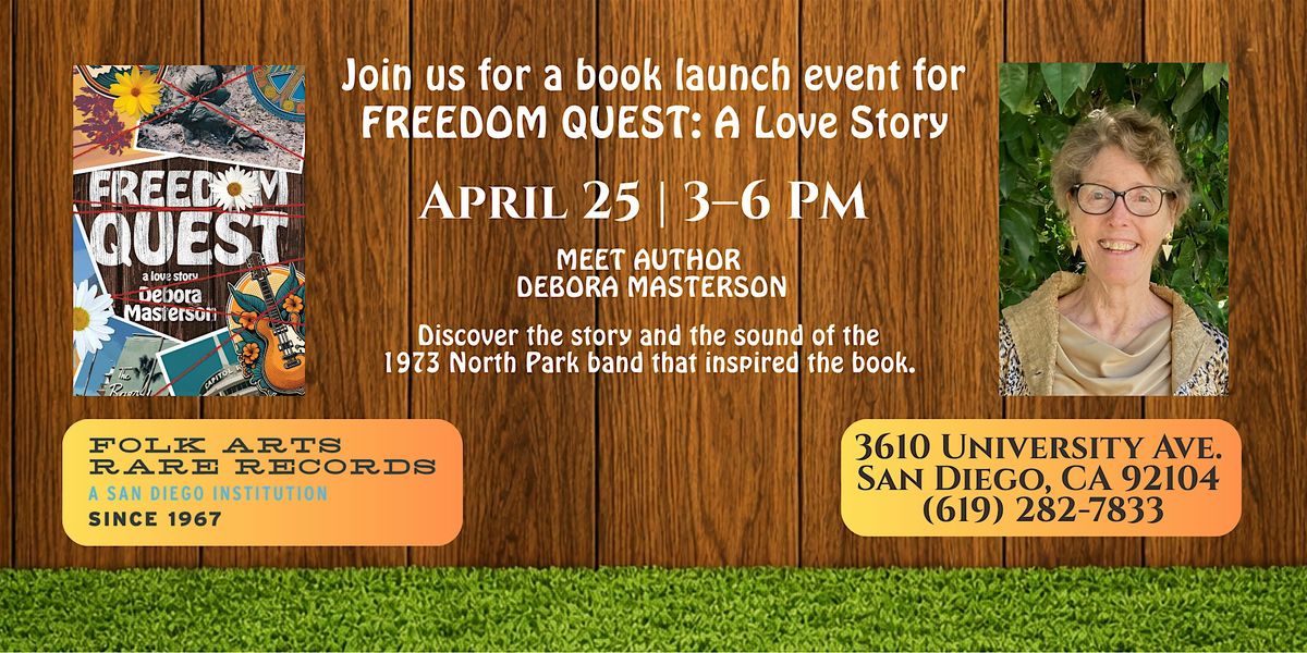 Join us at Folk Arts Rare Records in North Park San Diego for a special signing event with author Debora Masterson celebrating the releaes of her debut novel Freedom Quest: A Love Story. We'll be at one of California’s oldest record stores and we can't wait for you to discover the story and sounds of Freedom Quest, a band that got its launch in San Diego in the early 1970s. This afternoon promises to bring together story telling, music and nostalgia in a setting that perfectly matches the spirit of the novel. Meet the author, discover the story behind the book and enjoy the sounds of Freedom Quest.
