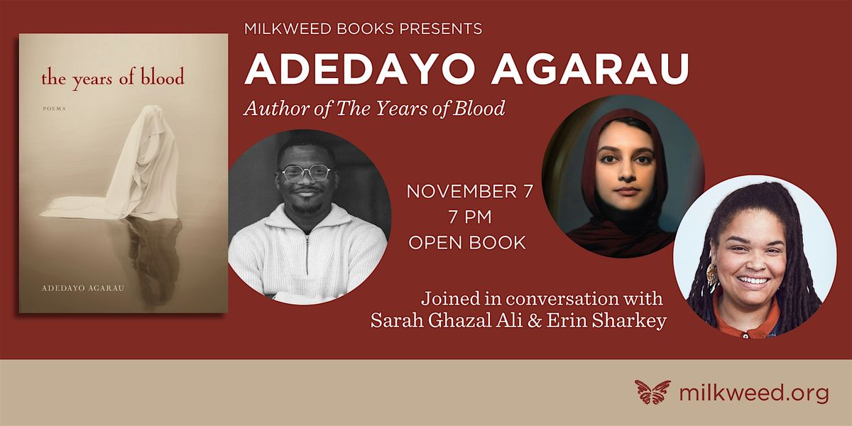 Join Milkweed Books as we present Adedayo Agarau's book launch for his collection, . Adedayo will read from the book and be joined in conversation with gracious local poets Sarah Ali Ghazal and Erin Sharkey.
