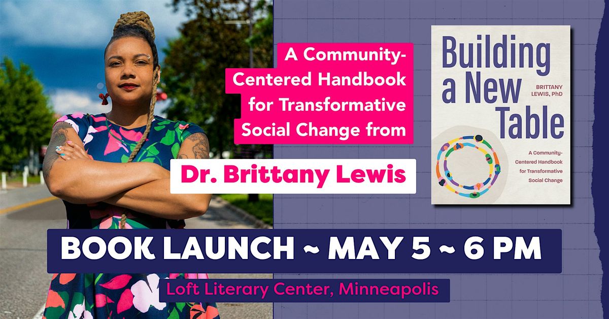 Please join us to celebrate the launch of Building a New Table: A Community-Centered Handbook for Transformative Social Change, by Brittany Lewis, on Tuesday, May 5, 2026 at 6:00 PM at Open Book Performance Hall, Loft Literary Center, 1011 Washington Ave S., #200, Minneapolis, MN 55415.