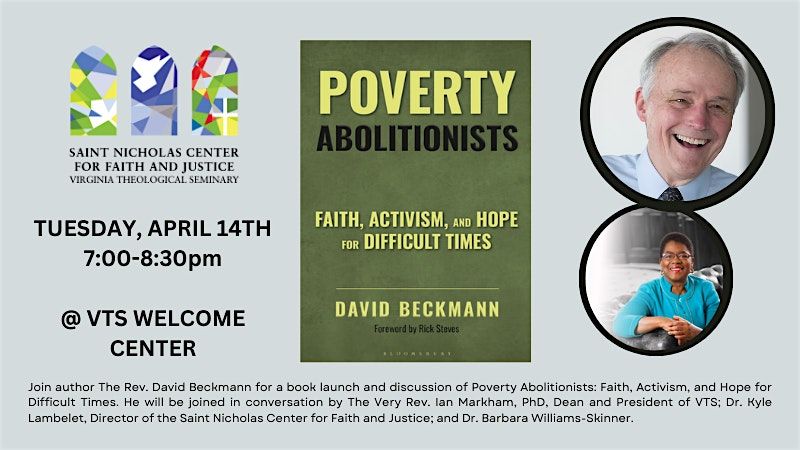 Join us for an in-person event celebrating the launch of Poverty Abolitionists: Faith, Activism, and Hope for Difficult Times. Meet the author The Rev. David Beckmann (President Emeritus, Bread for the World and Alliance to End Hunger) and dive into the powerful ideas aimed at ending poverty. Beckmann will be joined in conversation with The Very Rev. Ian Markham, PhD, Dean and President of Virginia Theological Seminary; Director of the Saint Nicholas Center for Faith and Justice, Dr. Kyle Lambelet; and Dr. Barbara Williams-Skinner.