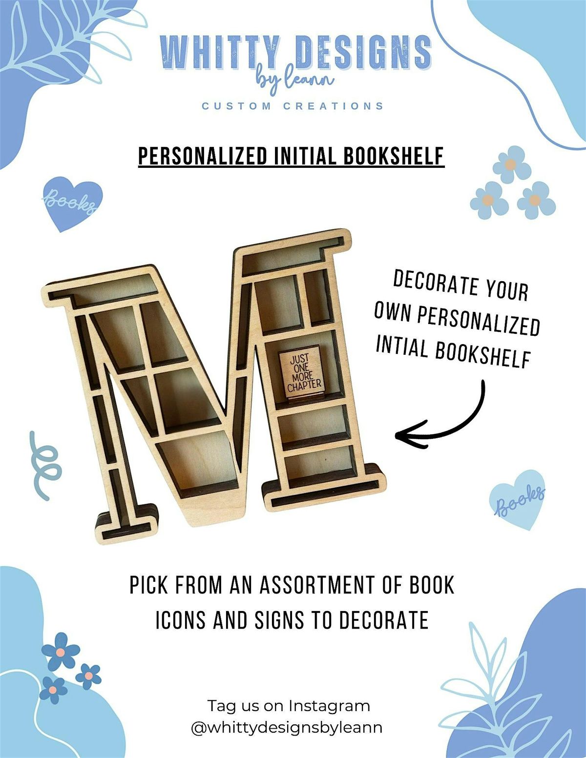 You will be provided a wooden initial bookshelf, composed of three layers of wood as well as lots of book icons to decorate. All supplies will be provided including paint pens and glue for decorating and assembling!
