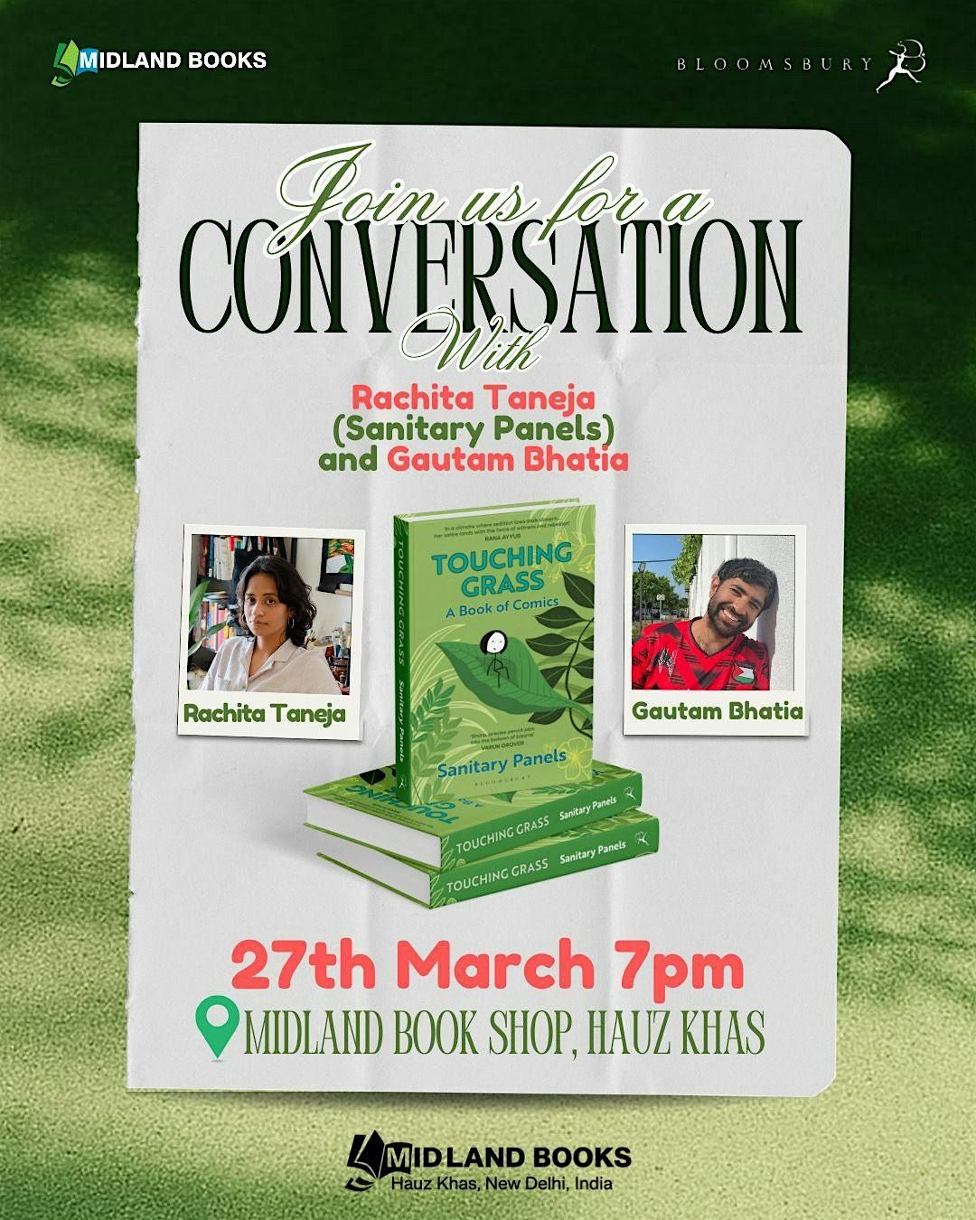 Join us at Midland Book Shop for a powerful conversation with Rachita Taneja (aka @sanitarypanels) in dialogue with Gautam Bhatia as they dive into the wit, chaos, and uncomfortable truths behind her bestselling comic book Touching Grass: A Book of Comics.