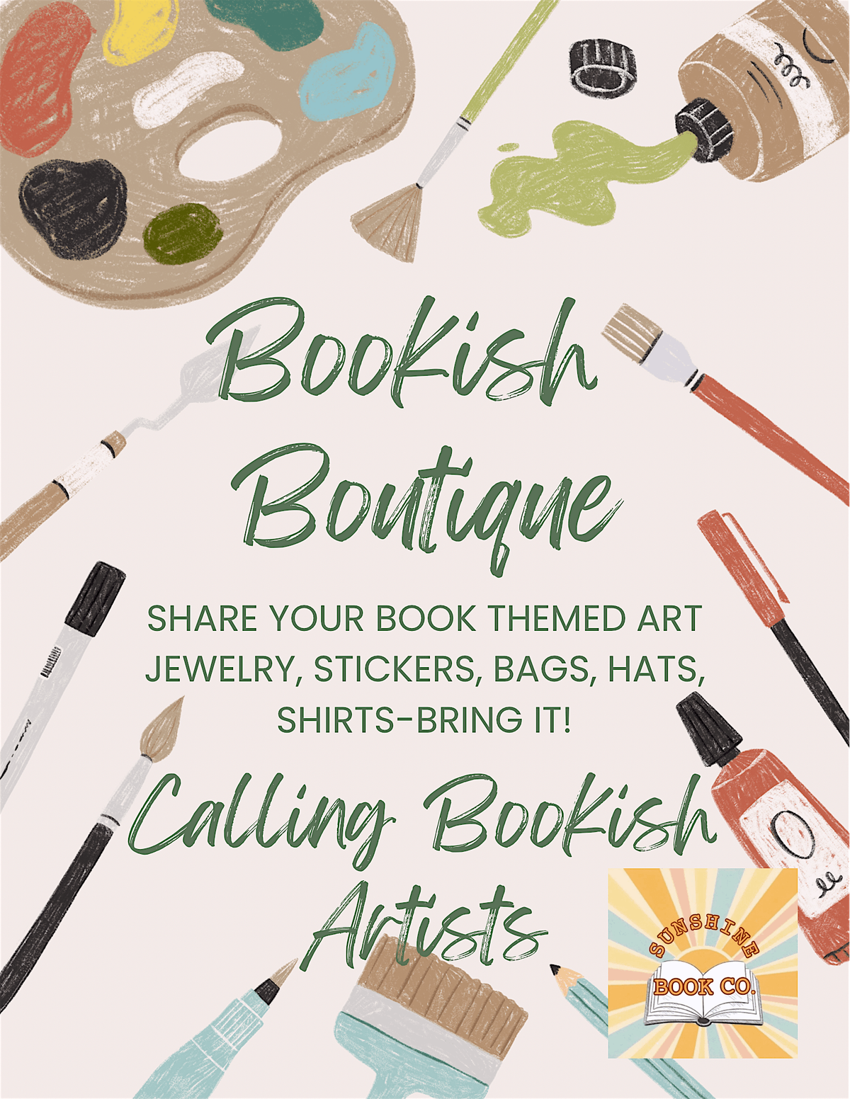 Sunshine Book Co is hosting a Bookish Boutique on March 1st , 11am-2pm. Cost per vendor is $15 for a table set up. This includes an outdoor spot in our backyard, as well as our marketing. Items should be book/literary related, but not books themselves. We will offer another event in April for authors. There is no need to purchase spots for others working with you. There is no fee for guests to attend. This is held the same day as the Clermont Farmer's Market.