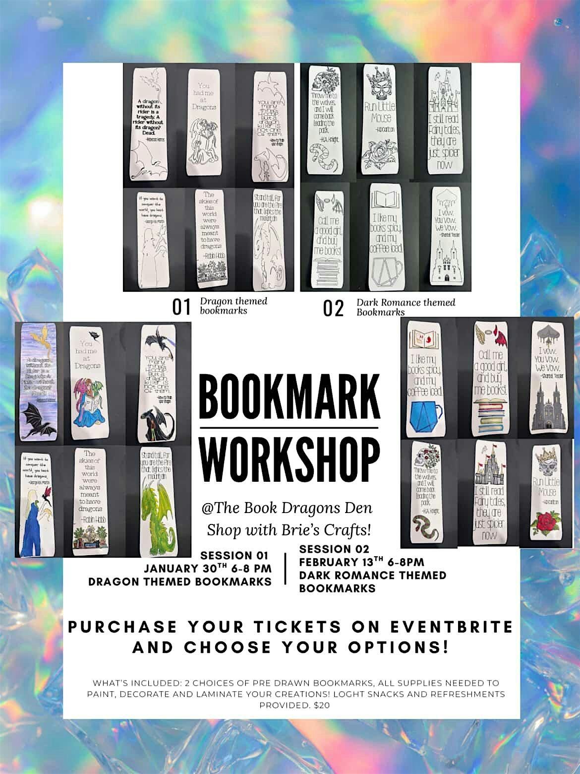 Calling all readers and creatives! Join us for a hands on bookmark workshop where imagination meets craftsmanship. In collaboration with Brie’s Craft, Book Dragons Den invites you to enjoy our dragon themed or dark romance theme designs and create beautiful one of a kind bookmarks. Perfect for your current read or as a thoughtful gift.