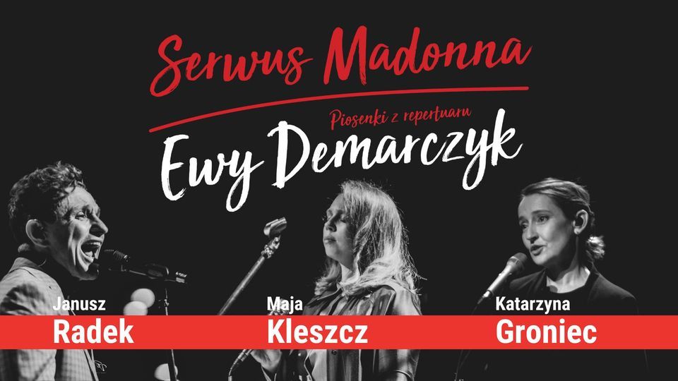 Janusz Radek, Maja Kleszcz i Katarzyna Groniec powracają z kultowym recitalem „Serwus Madonna” z piosenkami z repertuaru Ewy Demarczyk. „Serwus Madonna” to kultowy program koncertowy Janusza Radka, zawierający piosenki kompozytorów Piwnicy Pod Baranami: Zygmunta Koniecznego, Andrzeja Nowaka, Andrzeja Zaryckiego, Jana Kantego Pawluśkiewicza. Utwory znane m.in. z wykonań Ewy Demarczyk, to nie tylko przypomnienie liryki krakowskiej, ale także hołd złożony krakowskim Artystom. Nade wszystko jednak, to pięknie oprawione muzycznie i poetycko historie miłości, namiętności, tęsknot – po prostu życia.