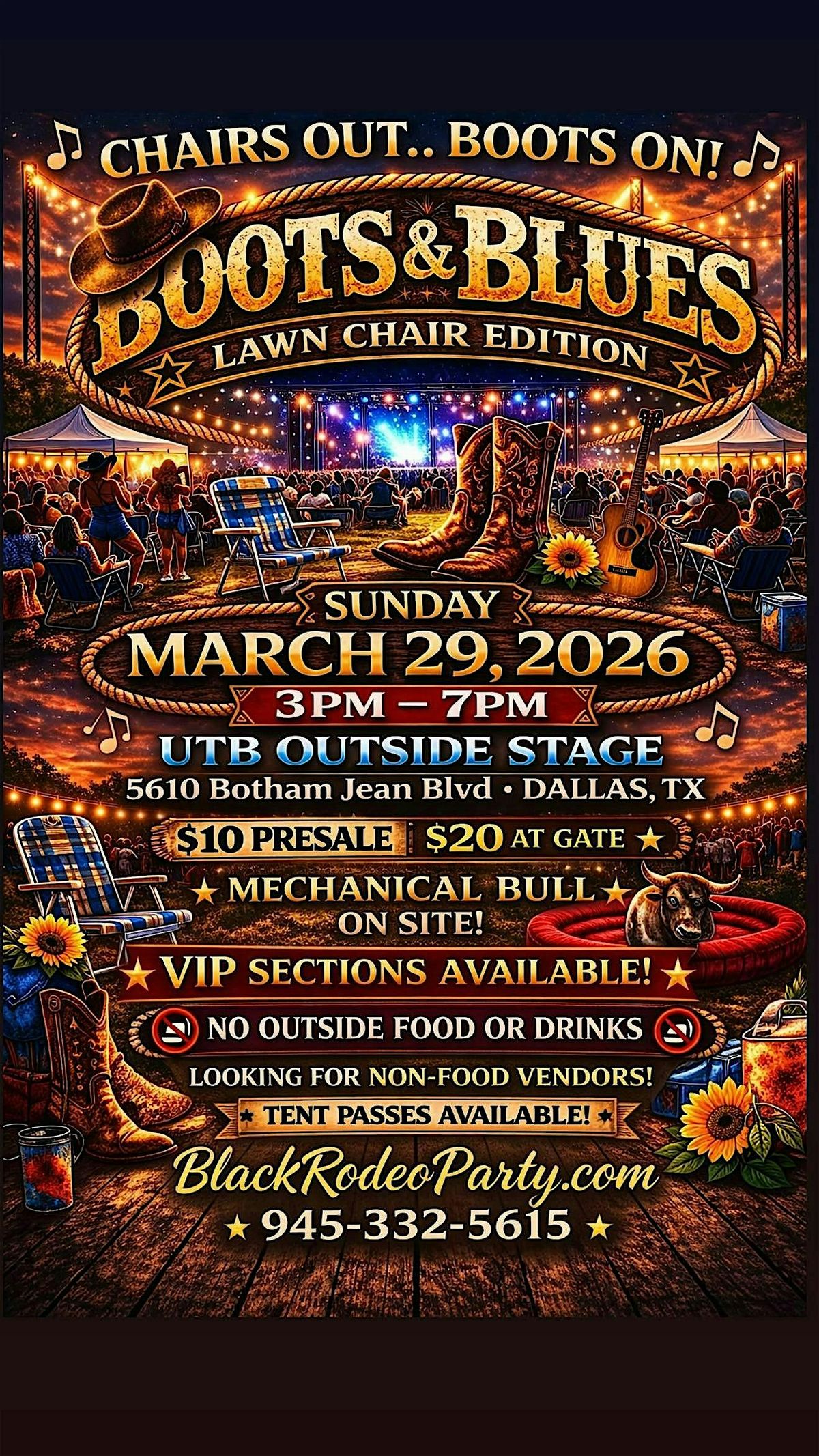 Get ready to kick back and enjoy some foot-stompin' blues tunes at the Boots & Blues Lawn Chair Edition! This in-person event is all about good vibes, great music, and comfy lawn chairs. Bring your friends, your boots, and your best lawn chair, and let's make it a night to remember. Don't miss out on this awesome gathering where blues music meets outdoor chillin’. See you there!