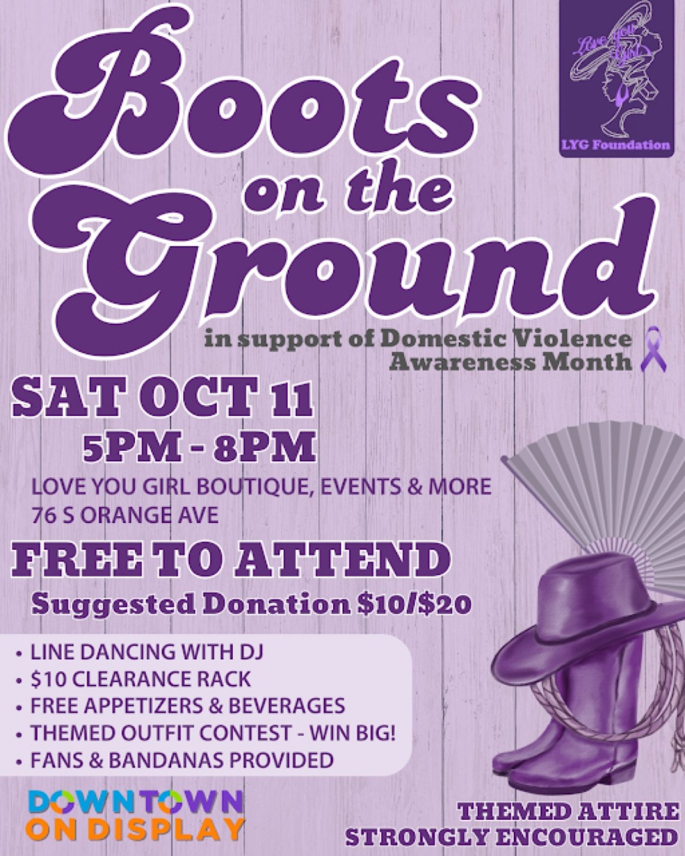 Step into your boots and join Love You Girl Boutique Events & More for Boots on the Ground on Saturday October 11 from 5:00–8:00 PM at 76 S. Orange Ave (entrance on Valley Street side) South Orange NJ. This special evening in honor of Domestic Violence Awareness Month will feature shopping deals line dancing with a DJ free appetizers and beverages and a themed outfit contest. Fans and bandanas will be provided. Attendance is free but guests are encouraged to bring a $10–$20 Stop & Shop or ShopRite gift card or make a monetary donation to directly support local shelters and survivors of domestic violence. RSVP is required. Presented as part of Downtown on Display a series of unique events that showcase the vibrancy energy and community spirit of South Orange’s downtown. Learn more and RSVP at southorangedowntown.org/events-calendar/boots-on-the-ground.