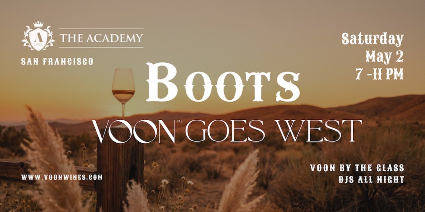 Join us at The Academy SF on Saturday, May 2nd for BOOTS: VOON Goes West — a chic, Western-inspired evening celebrating the wild, sun-drenched terroir of California’s Central Coast. Think: cowboy hats, bolo ties, incredible wines, and a DJ who has absolutely never played a country song.