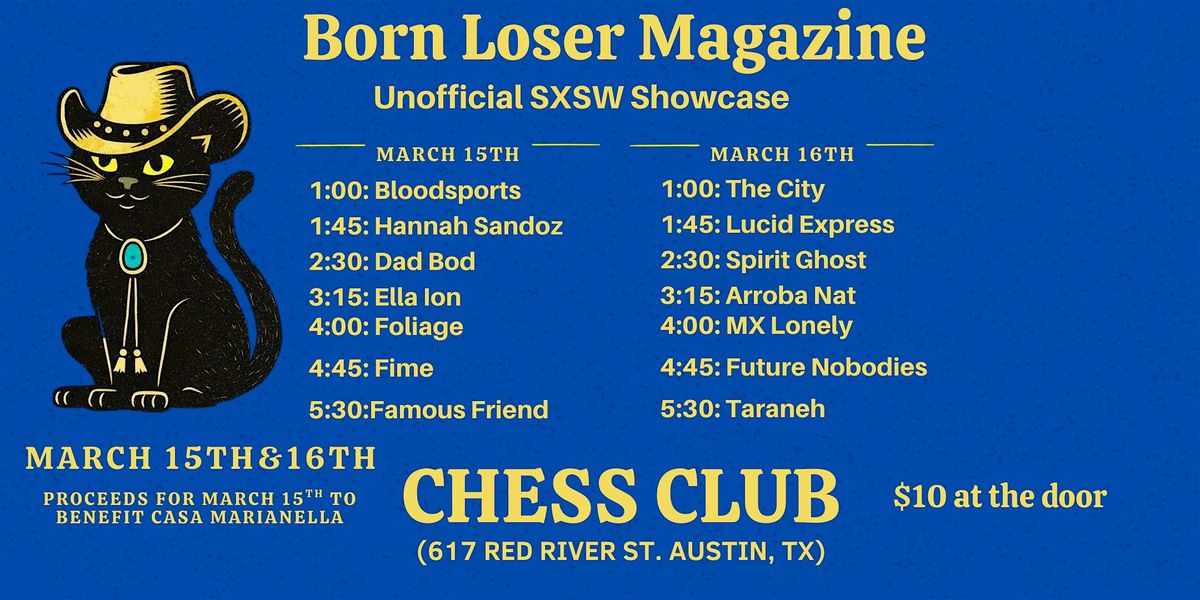 Join us at CHESS CLUB on March 15th and 16th from 1-6pm for the Born Loser Magazine SXSW Showcase! It's gonna be a grest event packed with great a great and sick music. Donโt miss out on this unique SXSW experienceโcome hang out, discover new sounds, and enjoy the scene with us!