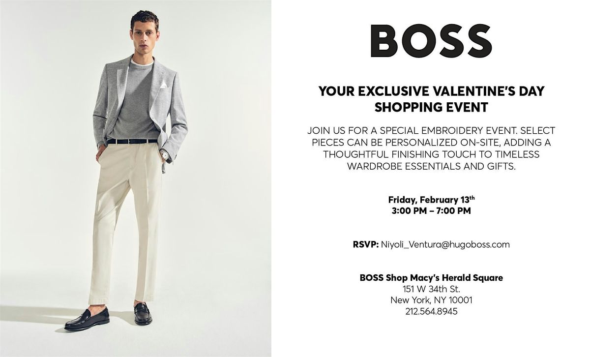 Get ready for an amazing in-person experience at the Boss Valentine's Monogram Event! Visit our Mens or Womens Boss Shop in Macys Herald Square, and when you make a purchase recieve complementary Embroidery on select pieces. Dive into a creative vibe where you can personalize gifts or accessories with your unique monogram. It’s all about adding that special touch to celebrate Valentine's Day in style.