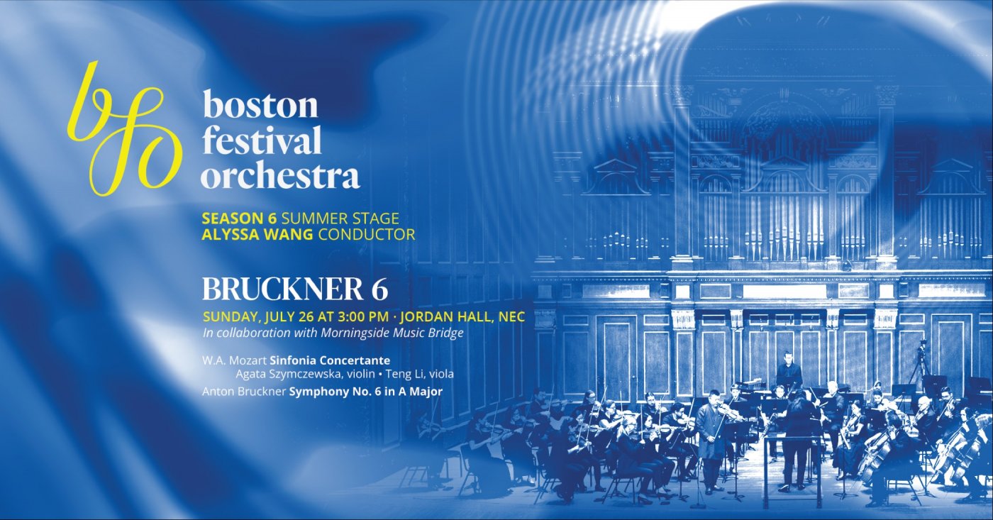In collaboration with Morningside Music Bridge, the Boston Festival Orchestra presents Mozart’s "Sinfonia Concertante" for Violin and Viola in E-flat major, an iconic double concerto featuring internationally acclaimed soloists, Agata Szymczewska (violin) and Teng Li (viola), both Morningside Music Bridge alumni and faculty, in elegant dialogue with the orchestra. The program culminates with Anton Bruckner’s "Symphony No. 6 in A major", a powerful and expansive symphony that moves from noble lyricism to triumphant grandeur. With its soaring themes and architectural brilliance, Bruckner’s Sixth brings the season to a thrilling close.