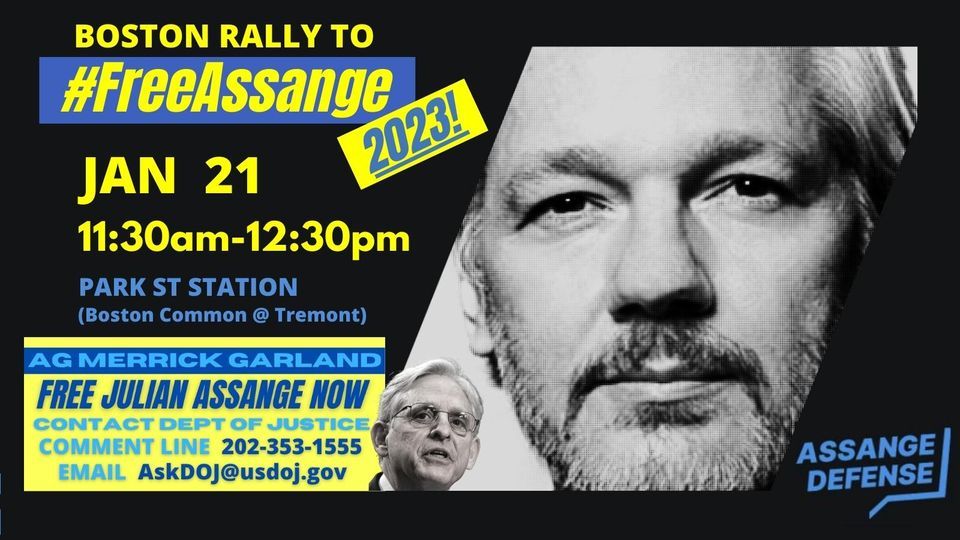 Supporters of Julian Assange will gather at Park Street Station on the Boston Common on Saturday, January 21 from 11:30 to 12:30 to raise their voices for the embattled and endangered journalist and publisher Julian Assange. For this rally, a special focus will be on the detention center at Guantanamo Bay, Cuba, marking the 21st anniversary of its opening on January 11, 2002. This symbol of US lawlessness is still open despite WikiLeaks publishing the GITMO Files in 2011 showing the awful abuses of the detainees. Assange suffers similarly to the detainees as he is held in limbo, tortured, uncharged, unconvicted, and his dire situation under reported. If our media faithfully reported on Guantanamo and Assange’s incarceration it could quickly put an end to both. https://twitter.com/wikileaks/status/1613083421332455424?s=20&t=lY8Ab1zSXuNdvuzPPhcJcAThe founder of WikiLeaks is awaiting word about whether the UK will hear his appeal of their decision to extradite him to the US, where he faces 175 years under the Espionage Act. His only “crime” is to have published evidence of US war crimes in the wars in Iraq and Afghanistan and other matters.