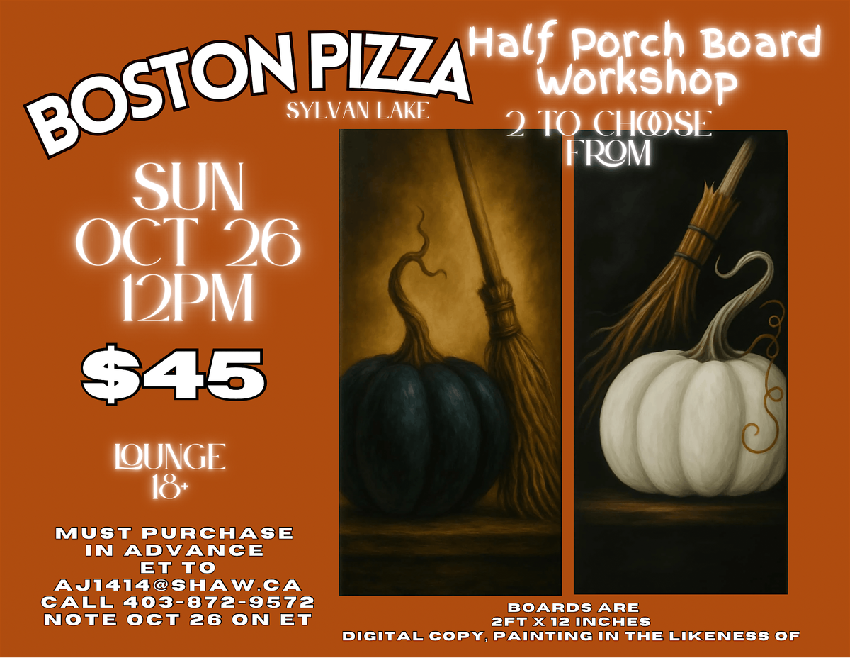 Come join us at Boston Pizza for a fun and creative half porch board workshop! This in-person event will give you the chance to unleash your artistic side while enjoying delicious food and drinks. Whether you're a beginner or a seasoned DIY-er, our workshop is perfect for anyone looking to add a personal touch to their home decor. Grab your friends and make it a night to remember at Boston Pizza Sylvan Lake!