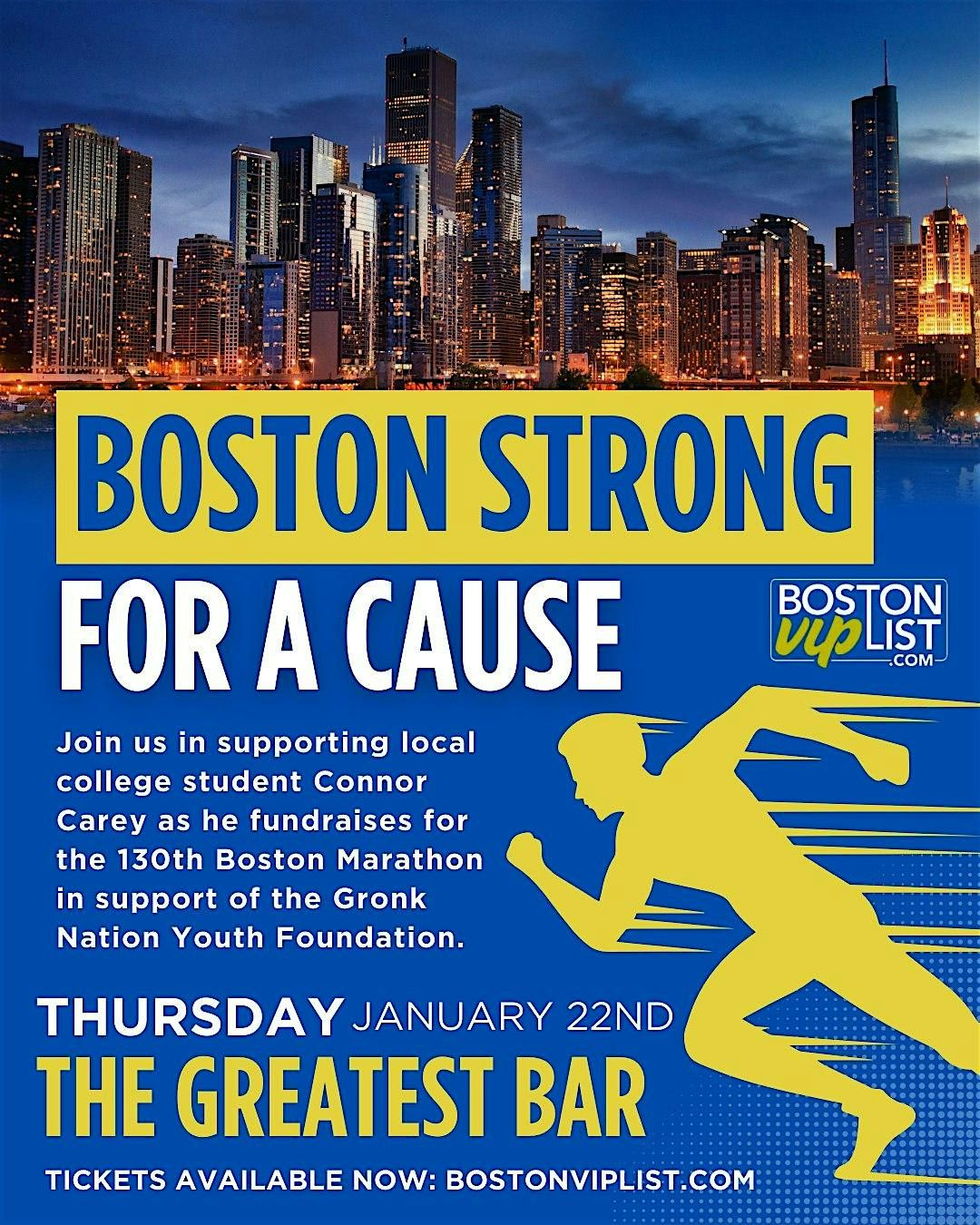 Boston, letโs show up. Join us at The Greatest Bar for an electric night in support of local college student Connor Carey, fundraising for the 130th Boston Marathon benefiting the Gronk Nation Youth Foundation. Here is the link to Connor's incredible and inspirig story: https://www.givengain.com/project/connor-raising-funds-for-gronk-nation-youth-foundation-115512