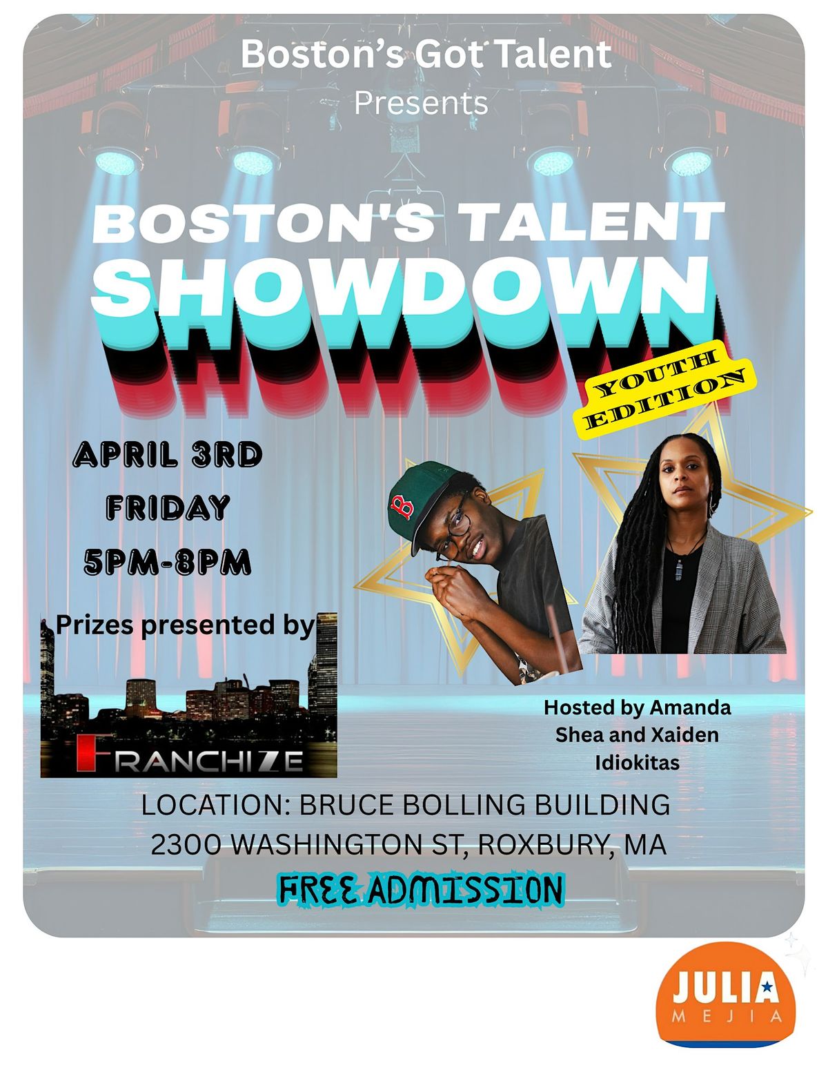 Boston’s Talent Showdown! Youth in all grades compete in vocals, dance & more for cash prizes. FREE admission! Perkins CC, 155 Talbot Ave,