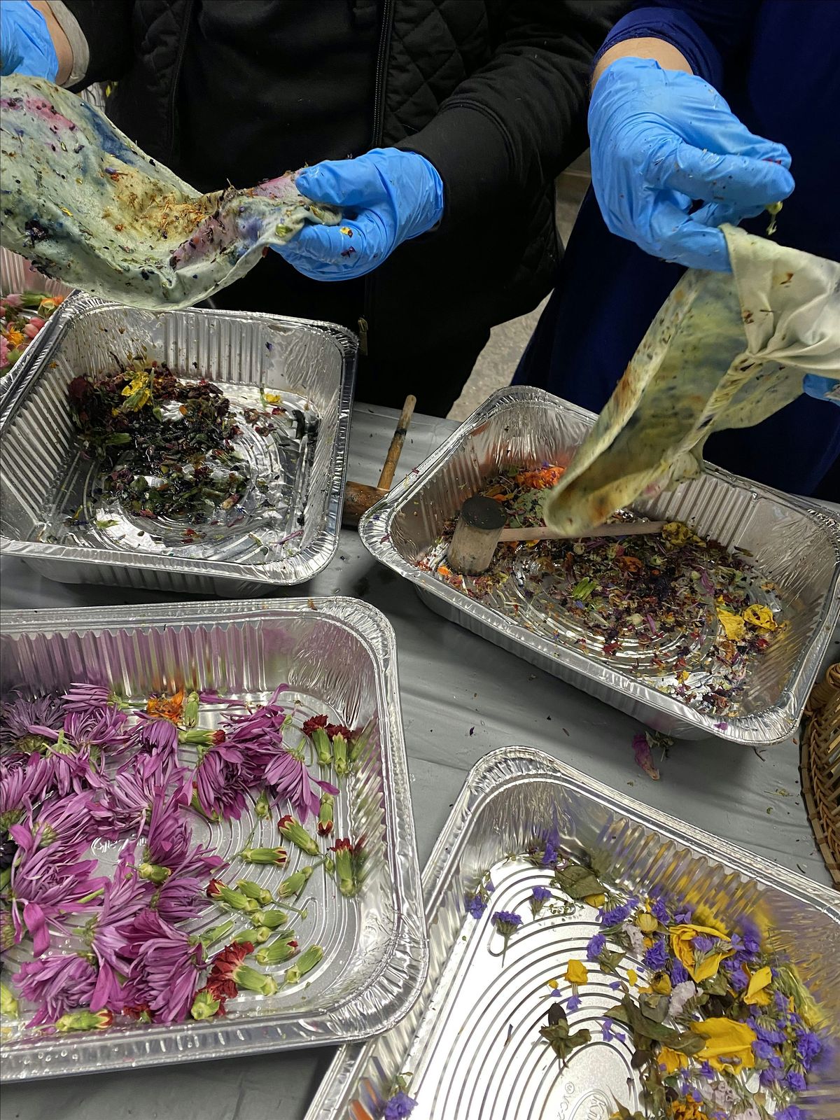 Learn fabric design using fresh and dried flowers to create your own wearable bandanna/kerchief/headband. One size.