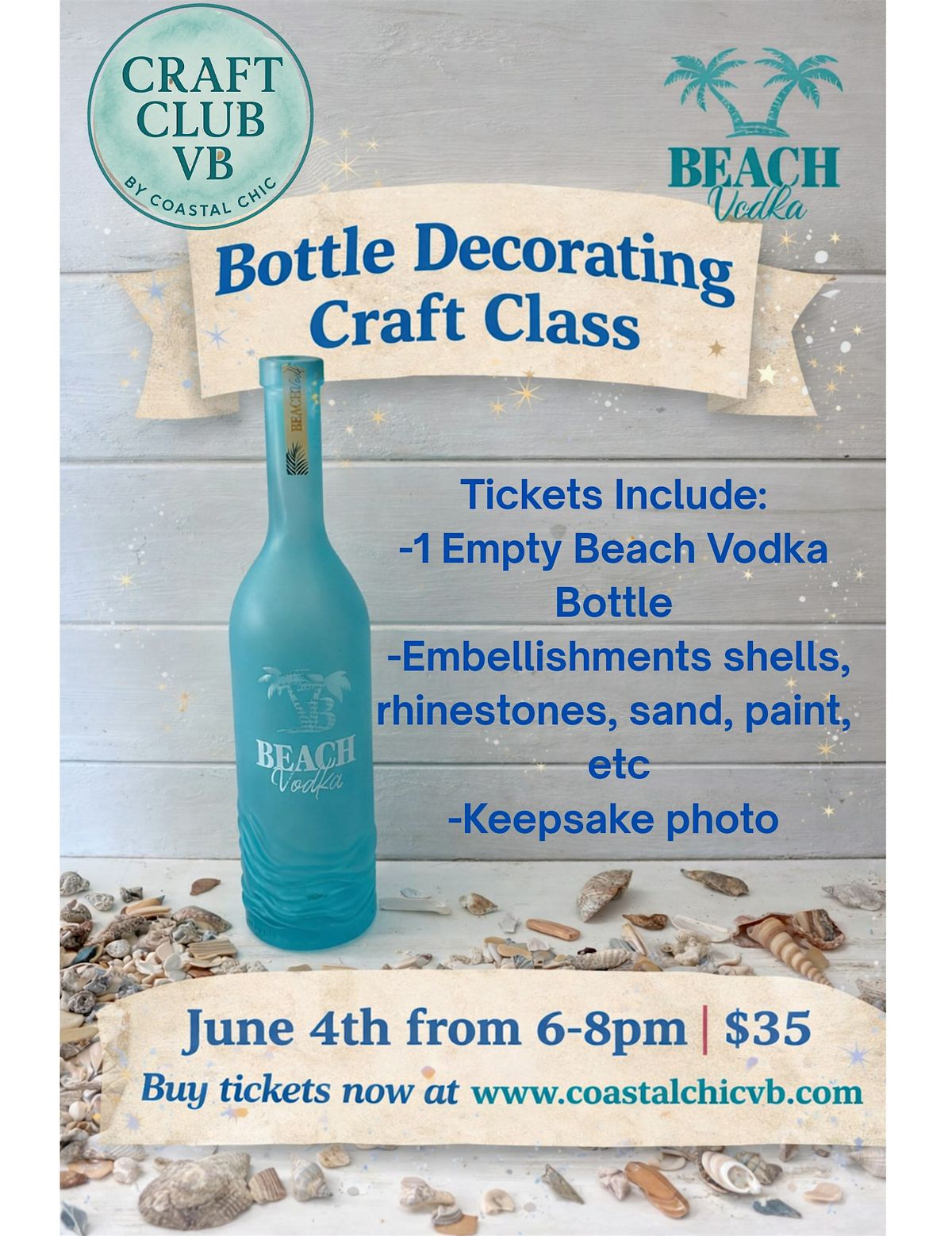 Join us for a Bottle Decorating Craft Class with Craft Club VB and Beach Vodka! In this fun and creative workshop, you’ll transform an empty Beach Vodka bottle into a beautiful coastal-inspired décor piece.
