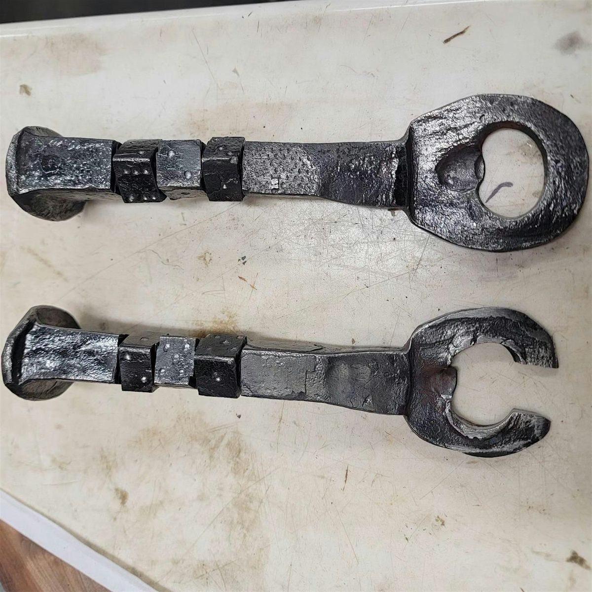 At War Horse Forge, veterans, active duty military, and first responders learn blacksmithing using traditional techniques. Our programs are located on our farm in Stafford, Virginia. In this class, you will forge a bottle opener from a railroad spike, creating a one-of-a-kind tool for opening beverages (image shows just two options).
