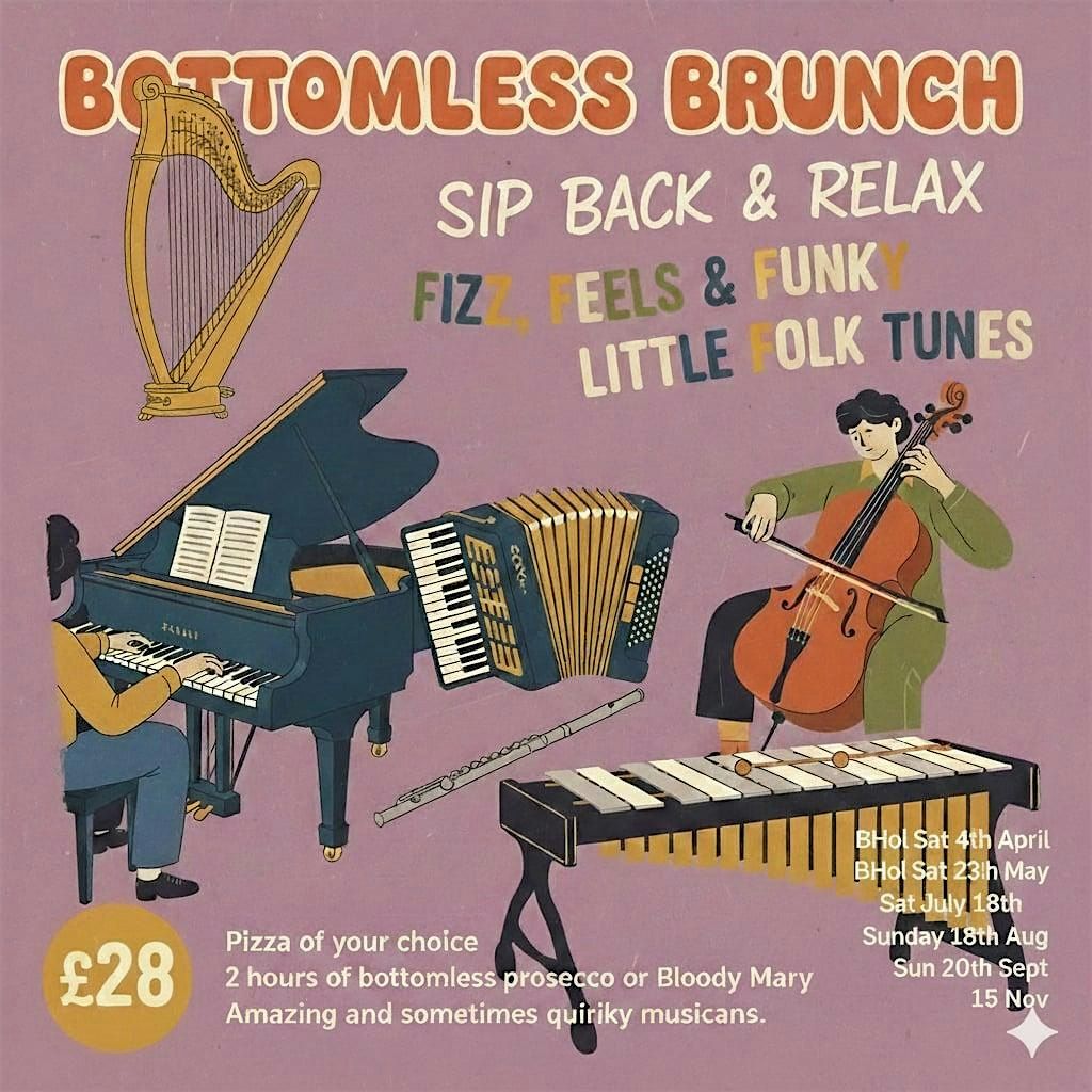 Join us for an epic brunch experience where the drinks keep flowing and the vibes never stop! We've got the best and sometimes downright quirky musicians coming your way. 2 hours of genuous fizz & Bloody Mary's, choose a home made, freshly cooked pizza and soak up the feels, and dance to some groovy funk beats. Perfect for catching up with friends or making new ones. Come hungry, stay thirsty, and get ready to brunch like never before!