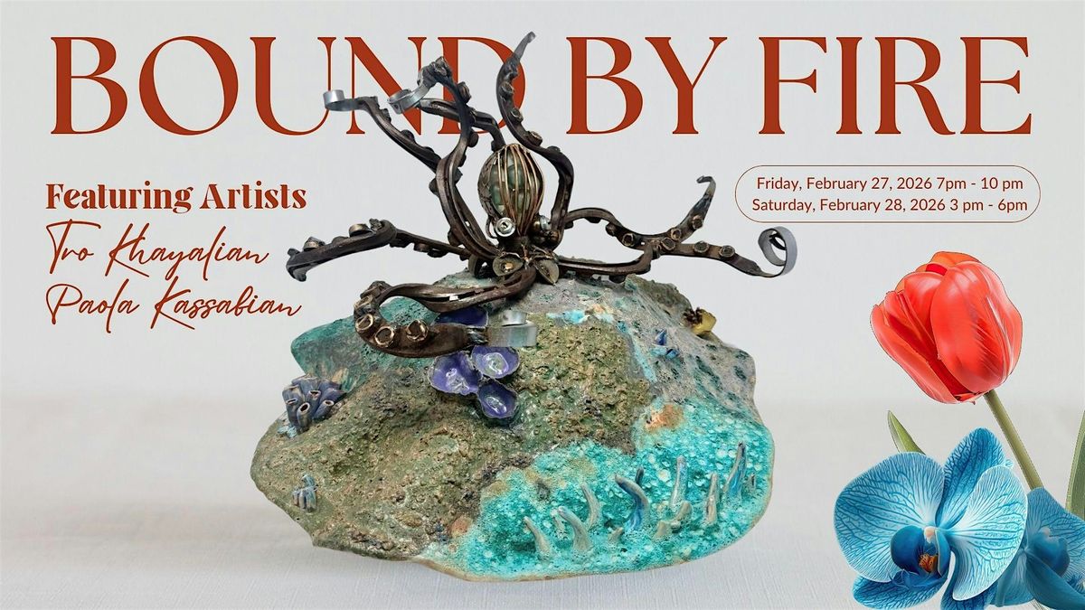 BOUND BY FIRE brings together two artists whose practices are united by heat, transformation, and elemental intensity — Tro Khayalian, an Armenian American abstract painter and metal sculptor, and Paola Kassabian, a ceramic artist whose work is shaped through flame, material, and process.