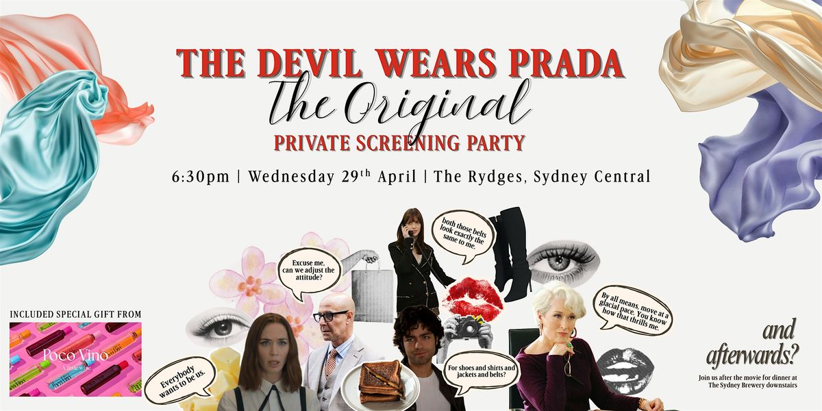 Join Bound & Co for a special private cinema screening of the iconic original (2006) The Devil Wears Prada at The Reservoir - a boutique private cinema within Rydges Sydney Central. Enjoy a night dedicated to sharp one-liners, questionable workplace expectations, and Vogue fashion. Re-watch this classic in time for TDWP the sequel releasing the next day!!