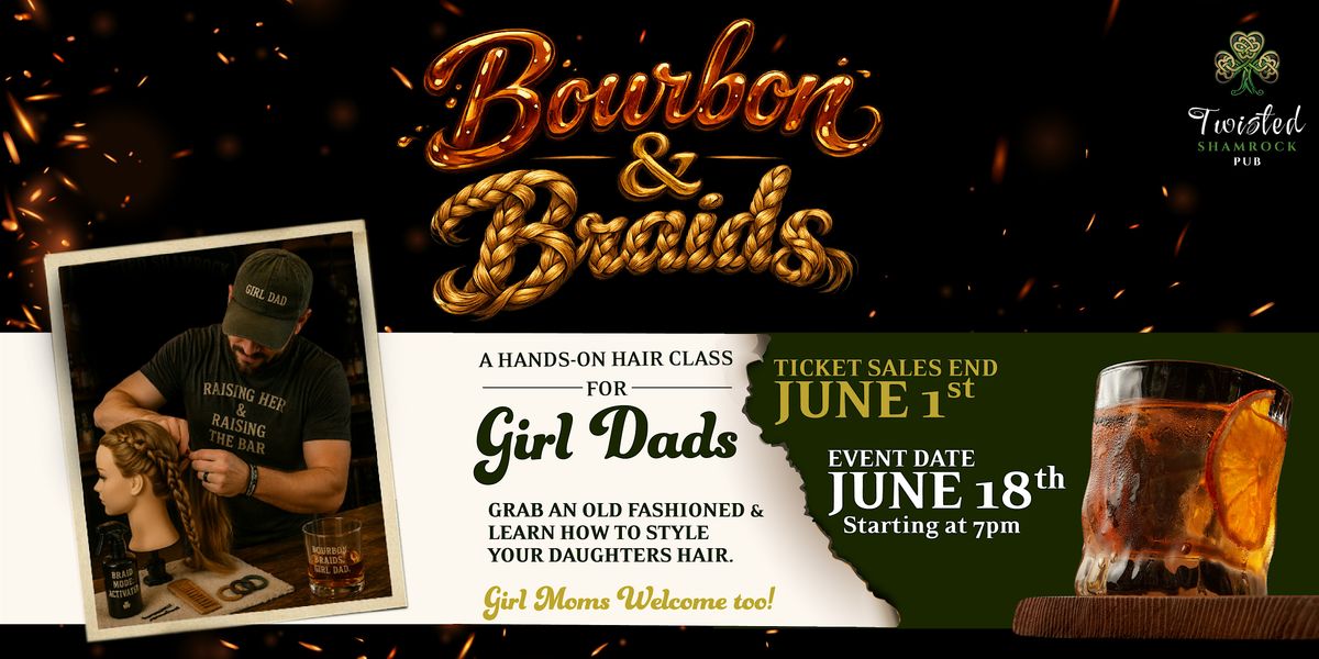 Join us at Twisted Shamrock on June 18th for Bourbon & Braids — a fun and unique hands-on class just for Girl Dads....& Moms!