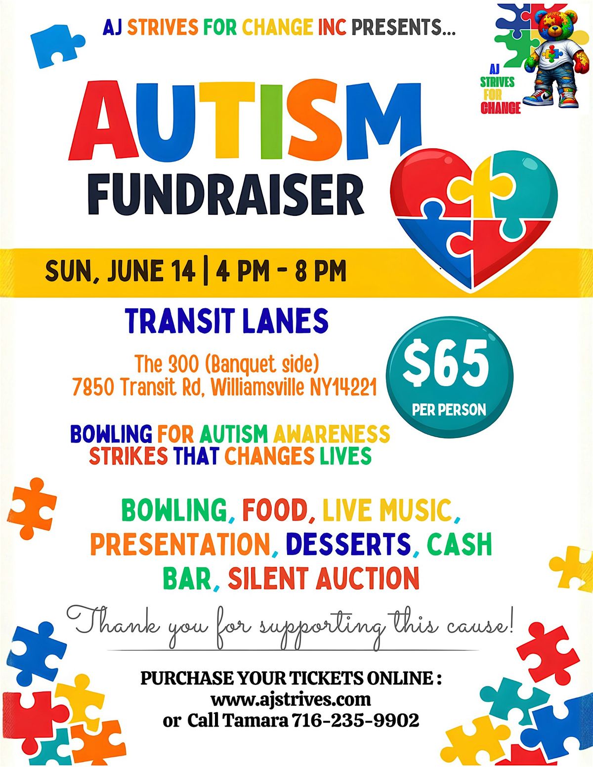 This event will directly support the mission of AJ Strives For Change Inc., an organization dedicated to empowering families, bridging gaps, and inspiring change for children with autism and developmental needs. Funds raised will help provide parent support programs, community workshops, resources, and direct assistance to families navigating the autism journey.