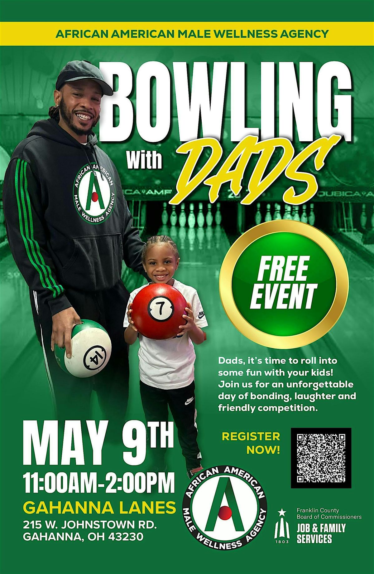 Join us at Gahanna Lanes for a fun-filled day of bowling, bonding, and resources for dads and kids. Fathers will receive a free pair of bowling shoes—then hit the lanes with your child and enjoy quality time together. We’ll also have free fatherhood and family resources available to support you and your child beyond the event.