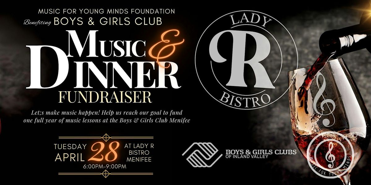 Join us Tuesday, April 28th, 6–9 PM at Lady R Bistro for a special evening benefiting the Boys & Girls Club of Menifee through the Music for Young Minds Foundation. Together, we’re raising funds to provide one full year of free music lessons for local kids.