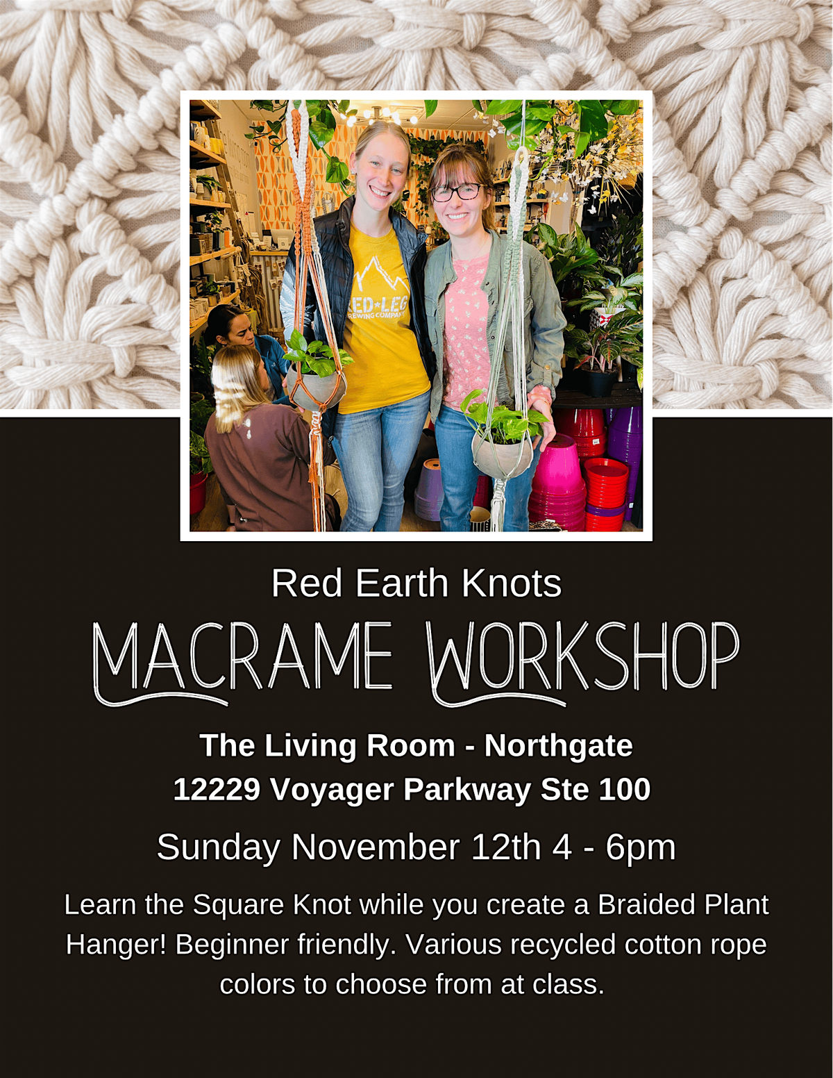 In this hands-on beginner friendly macrame class you'll be working with high quality recycled cotton rope and learn commonly used macrame knots to create a functional piece of fiber art you'll enjoy for years to come.