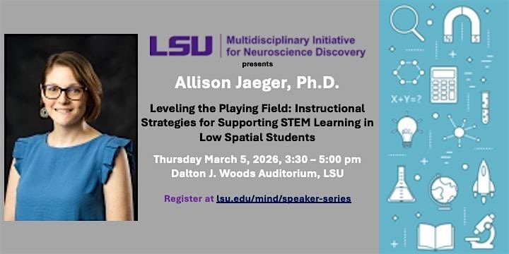 Please join us for a talk by Dr. Allison Jaeger titled Leveling the Playing Field: Instructional Strategies for Supporting STEM Learning in Low Spatial Students.