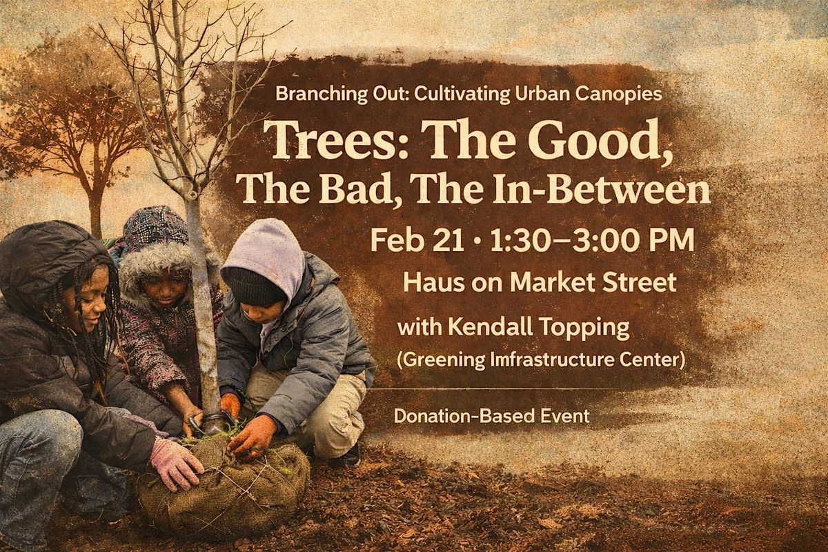Join us Friday, February 21st from 1:30–3:00 PM for an interactive tree stewardship workshop led by community arborist Kendall Topping, presenting on behalf of the Greening Infrastructure Center. Together, we’ll explore the full truth about urban trees: not just the beauty and benefits, but also the realities—who gets shade, who gets heat, and how tree equity shapes health, comfort, and quality of life in our neighborhoods.