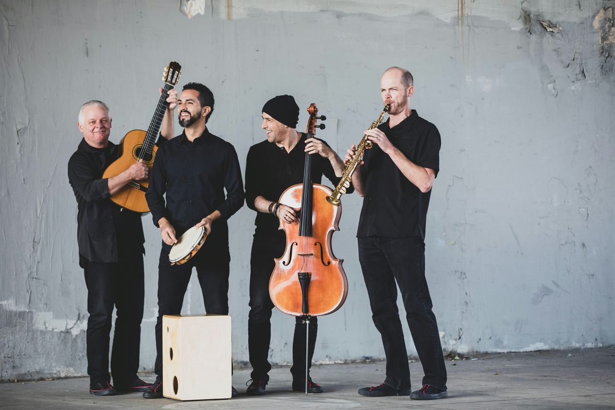Quarteto Nuevo merges western classical, eastern European folk, Latin and jazz with an organic feel that packs a wallop! The ensemble’s razor-sharp precision is enhanced by jazzy interludes, lightly rumbling percussion motifs and mesmerizing rhythms. They effectively meld the music of ancient worlds and faraway places with a contemporary groove that enchants audiences of all ages! Winners of the Beverly Hills National Auditions, Quarteto’s master musicians create emotionally-charged soundscapes with instruments and sensibilities that represent very different world cultures. Their unique instrumentation – soprano saxophone/alto flute (Damon Zick), cello (Jacob Szekely), guitar (Kenton Youngstrom) and hand percussion (Felipe Fraga) – richly colors their wide-ranging repertoire.