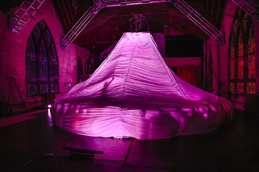 Inspired by the idea of creating community in trying times, Brave Space starts as a puddle of fabric on the floor, and grows to encompass a world of wonders that includes juggling, cyr wheel, and duo trapeze, a rope act like no other, and awe-inspiring feats of balance and strength. The audience is limited to 100 people per show, and audience members must be able to sit on the floor, stand up, walk around for the duration of the performance. Audience members requesting assistance, or a chair to sit in, should email us at [email protected] before the show. Brave Space may make persons suffering from claustrophobia feel uncomfortable at times.