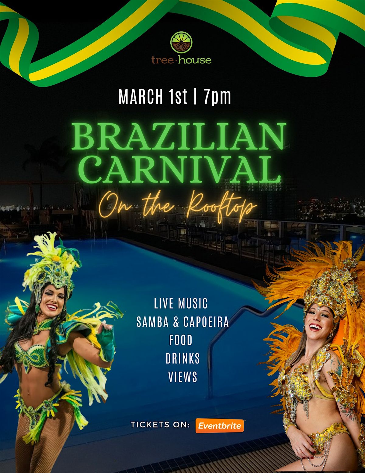 Celebrate the vibrant and colorful Brazilian Carnival at Treehouse Rooftop! Join us for a night filled with samba dancing, live music, delicious Brazilian cuisine, and festive decorations. Get ready to immerse yourself in the lively spirit of Brazil right in the heart of the city. Don't miss out on this unforgettable evening under the starry sky!