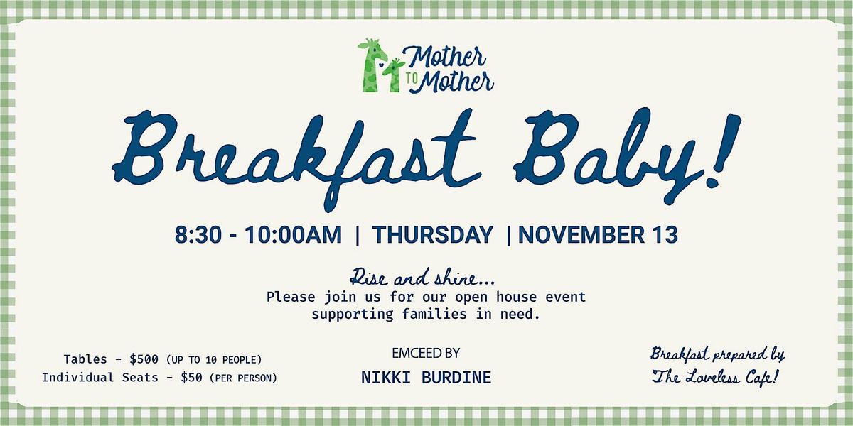 Join us for the Mother to Mother Breakfast Baby event, a heartwarming morning dedicated to supporting families in need. Enjoy a delicious breakfast prepared by The Loveless Café while connecting with community leaders, friends, and fellow supporters and learning more about the work Mother to Mother does. Emceed by Nikki Burdine — host, content creator, media coach, and mom — this special open house invites you to come together for a meaningful cause that nourishes both body and heart.