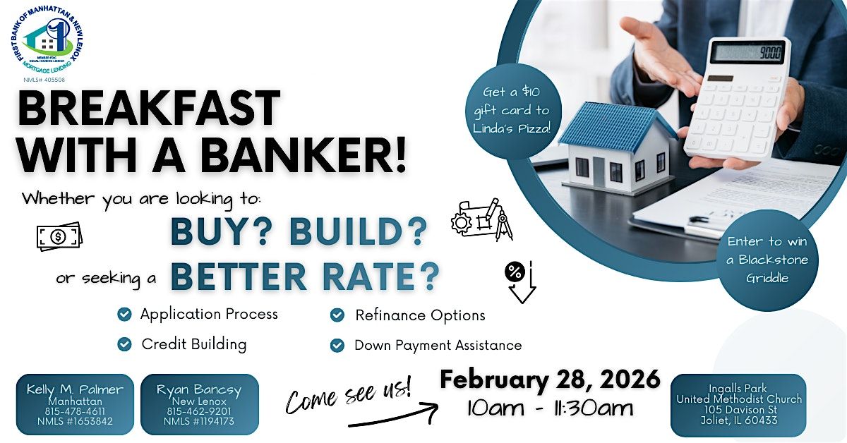 Welcome to Breakfast with a Banker Mortgage Workshop! Join First Bank of Manhattan & New Lenox at Ingalls Park United Methodist Church, 105 Davison St., Joliet, on February 28, 2026 at 10:00 AM (Central Time) for a morning filled with valuable insights on mortgages. Our expert bankers will guide you through the process and answer all your questions in a casual setting. Don't miss this opportunity to kickstart your home buying journey with confidence. See you there!