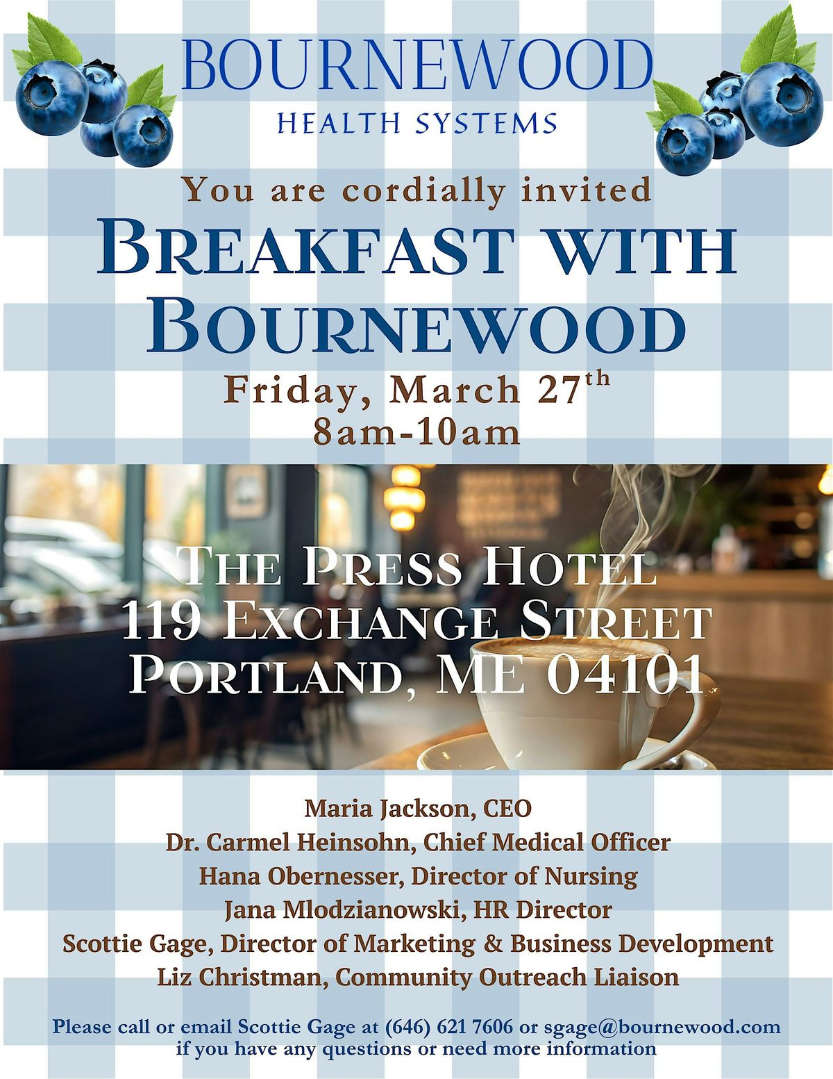 Join Bournewood Health Systems for "Breakfast with Bournewood" at the Press Hotel in Portland, Maine. This relaxed morning gathering is a chance to connect with colleagues in the behavioral health community and spend some time with our leadership and outreach team.