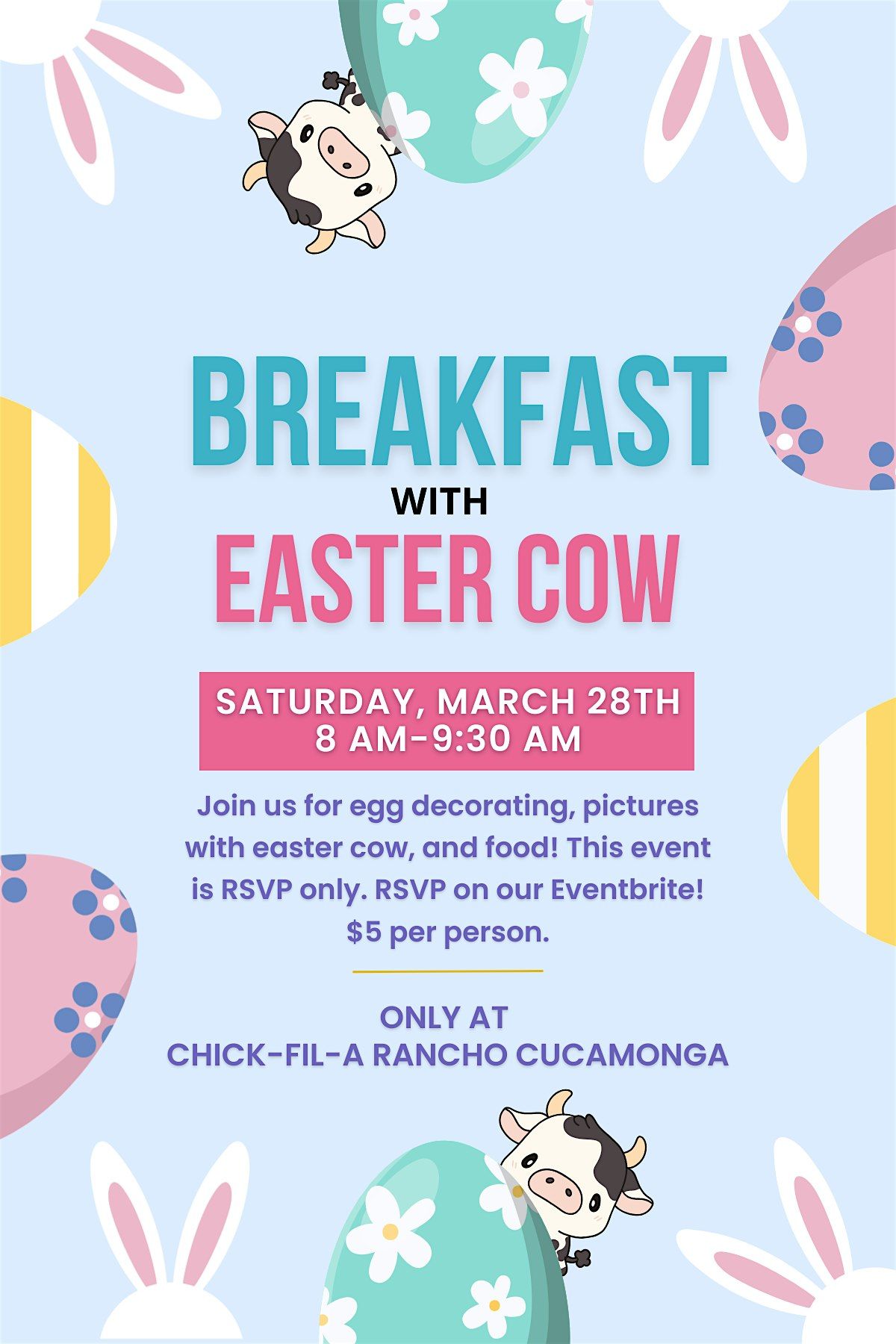 Join us for egg decorating, pictures with easter cow, and food! This event is RSVP only. Tickets are $5 per person (for guests older than 2 years of age), but we will have a mini breakfast buffet so everyone gets fed! Guests will also receive a goodie bag before they leave. Guests under 2 years of age are free!
